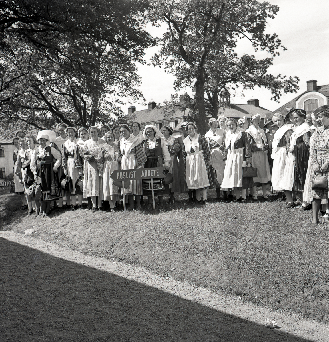 Ett antal kvinnor i husmorsdräkt och Värendsdräkt m.m., har samlats på gräsvallen i nordvästra hörnet av skolgården till dåv. Flickskolan (Graffmanska skolan).