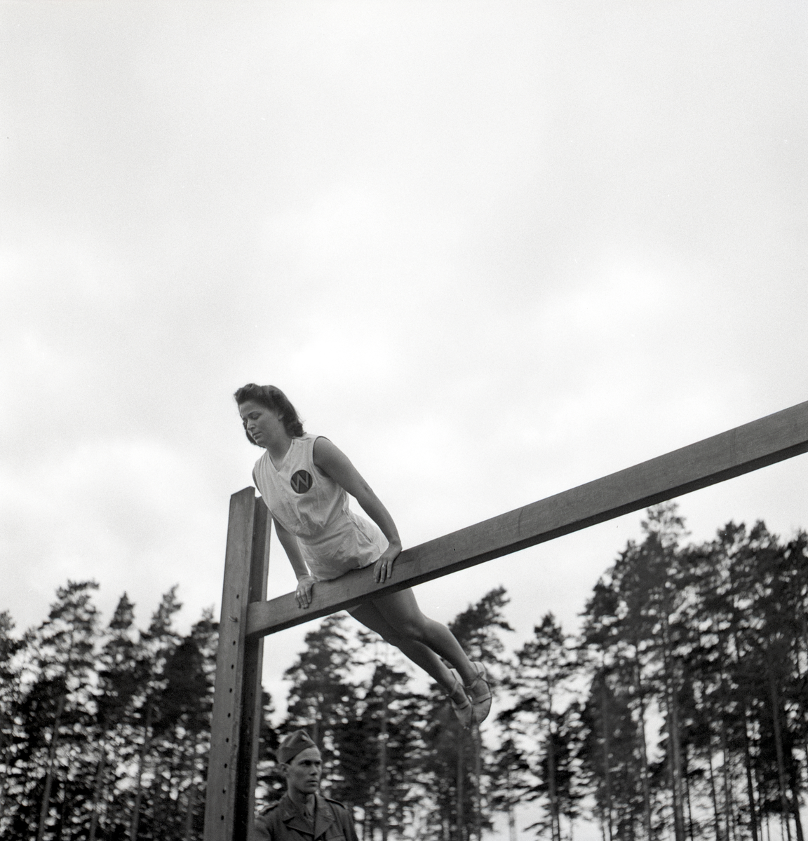Uppvisning på bom av kvinnlig gymnast på Gymnastikens dag.