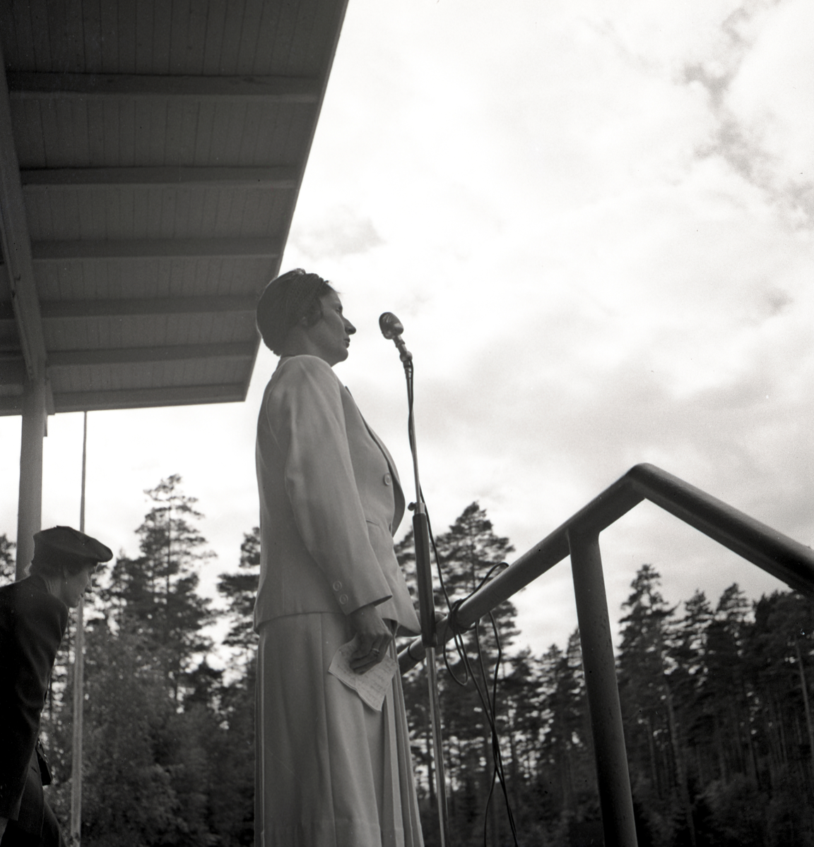En kvinna i ljus dräkt står vid en mikrofon på hedersläktaren och