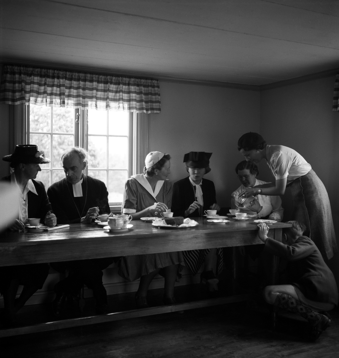 Skidfrämjandets dag. Fyllerydsstugan. Kaffebjudning i det nya huset. Biskop Yngve Brilioth och ett antal damer vid kaffebordet.