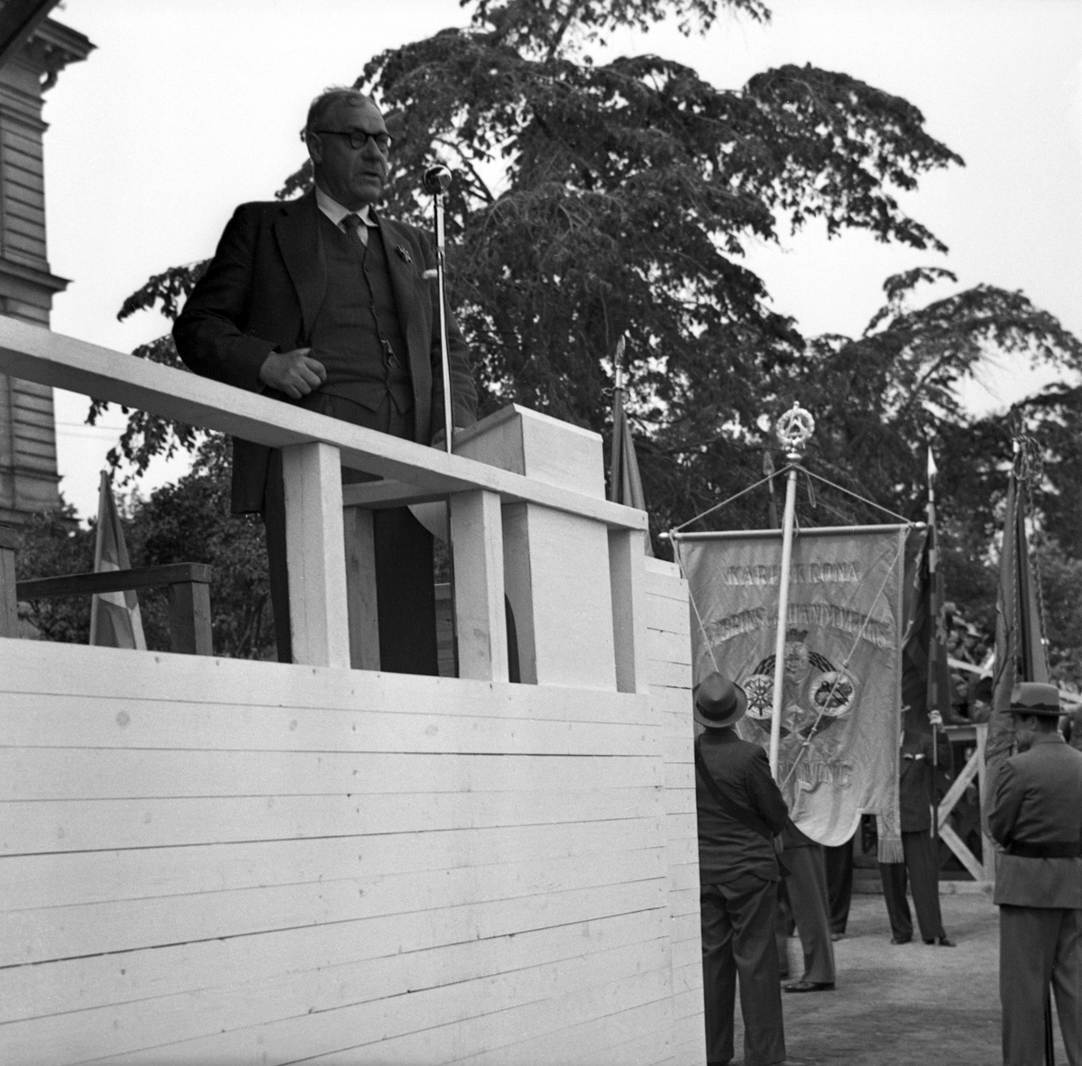 Hantverkets dag. En äldre man i talarstolen på hedersläktaren utanför läroverket.