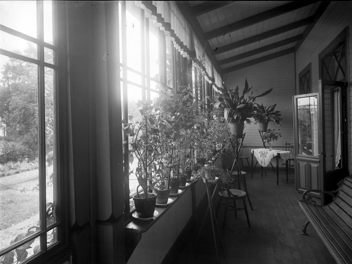 Okänd bostad i Växjö. Interiör av en glasveranda med en lång rad planterade växter.