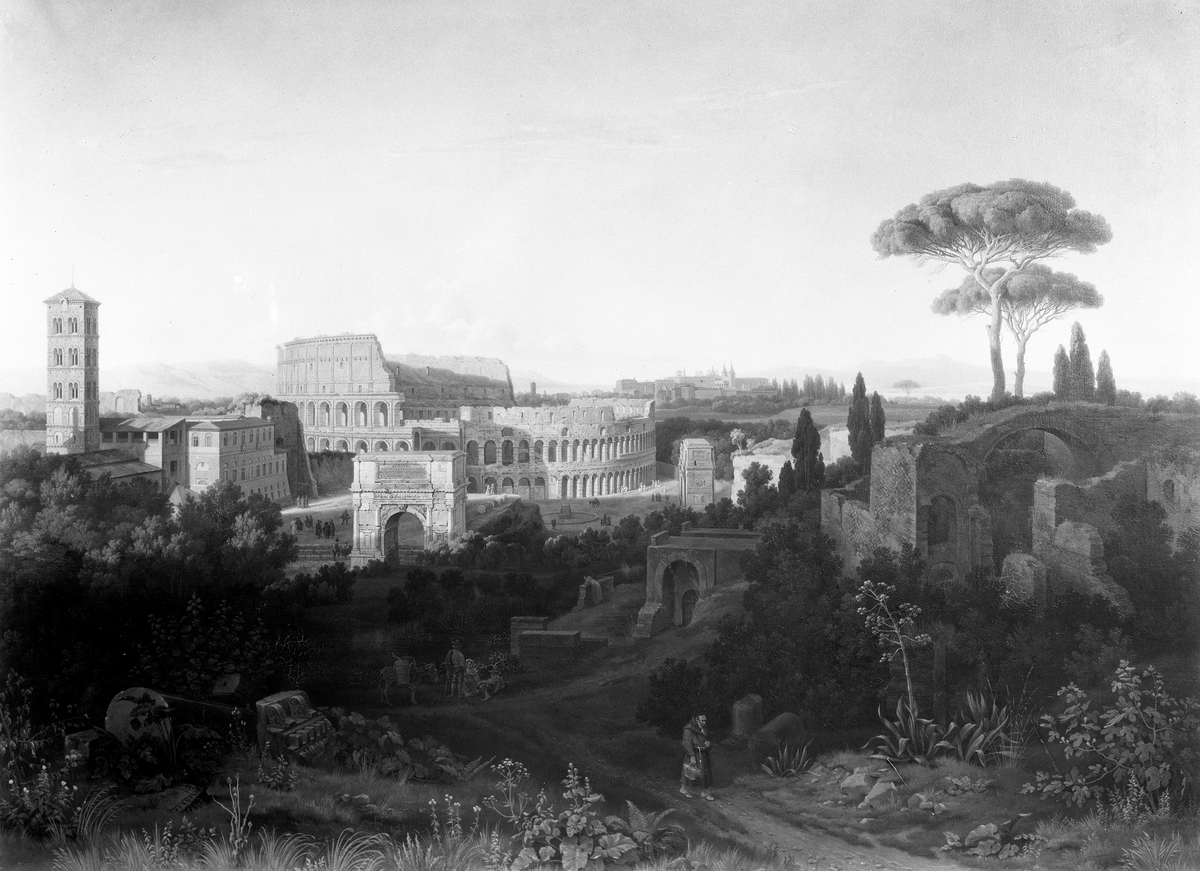 Närbild av en tavla föreställande Palatinen med omnejd i Rom.
