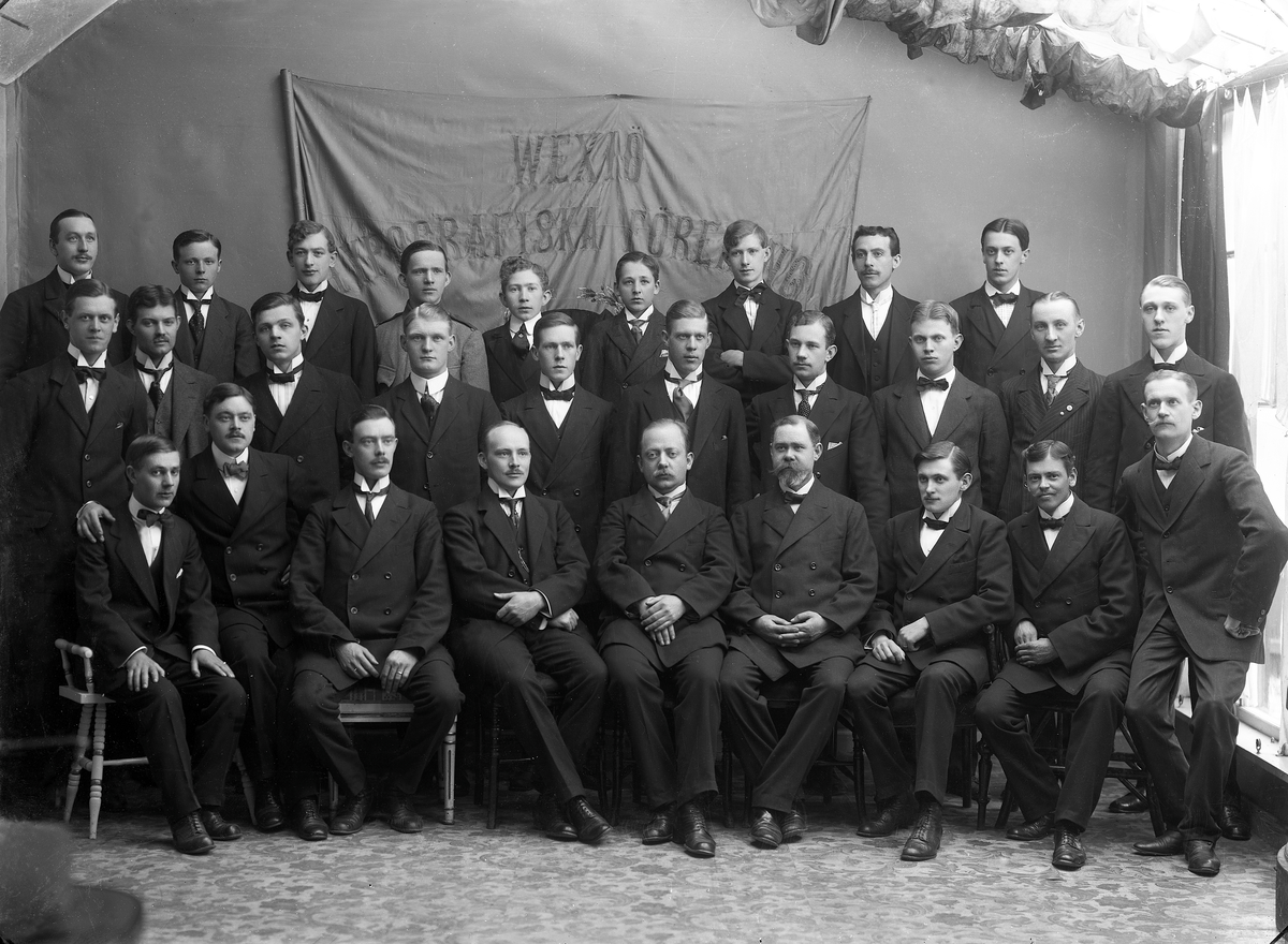 Växjö Typografiska Förening fotograferade i ateljé runt 1900.