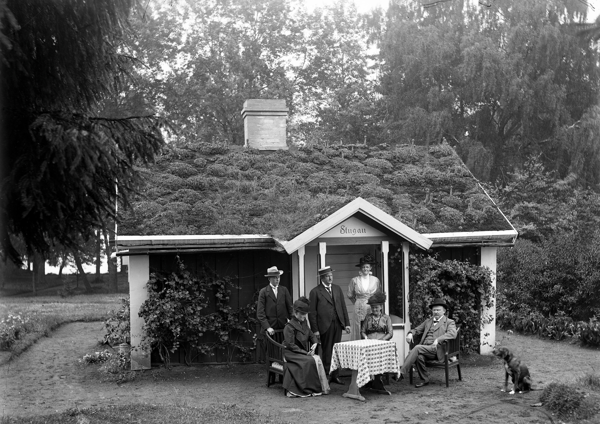 Bröderna Anderssons sommarhus "Stugan" på Evedal. Ca. 1912. Edvard och Helge Andersson med sällskap.