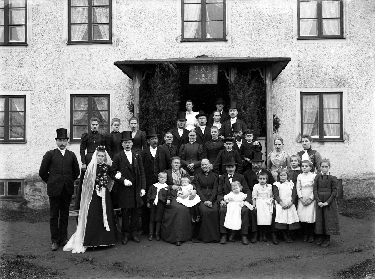 Brudpar och bröllopsgäster fotograferade framför ett reveterat bostadshus. 26 december 1900.