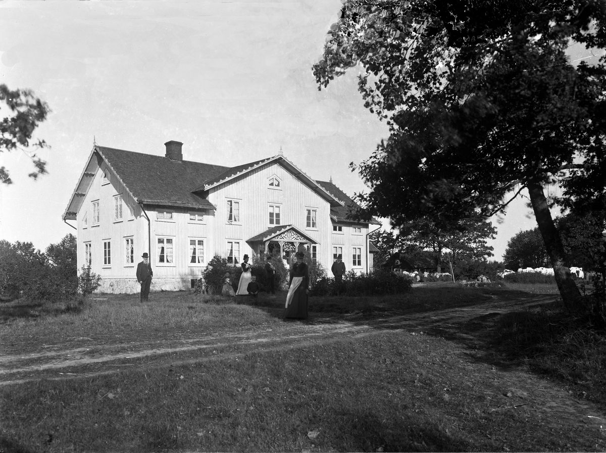 Familj framför okänt bostadshus, sent 1800-tal.