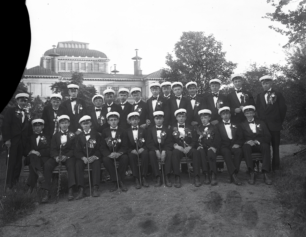 Studentgrupp i Museiparken, med Läroverket som fond. 1920.