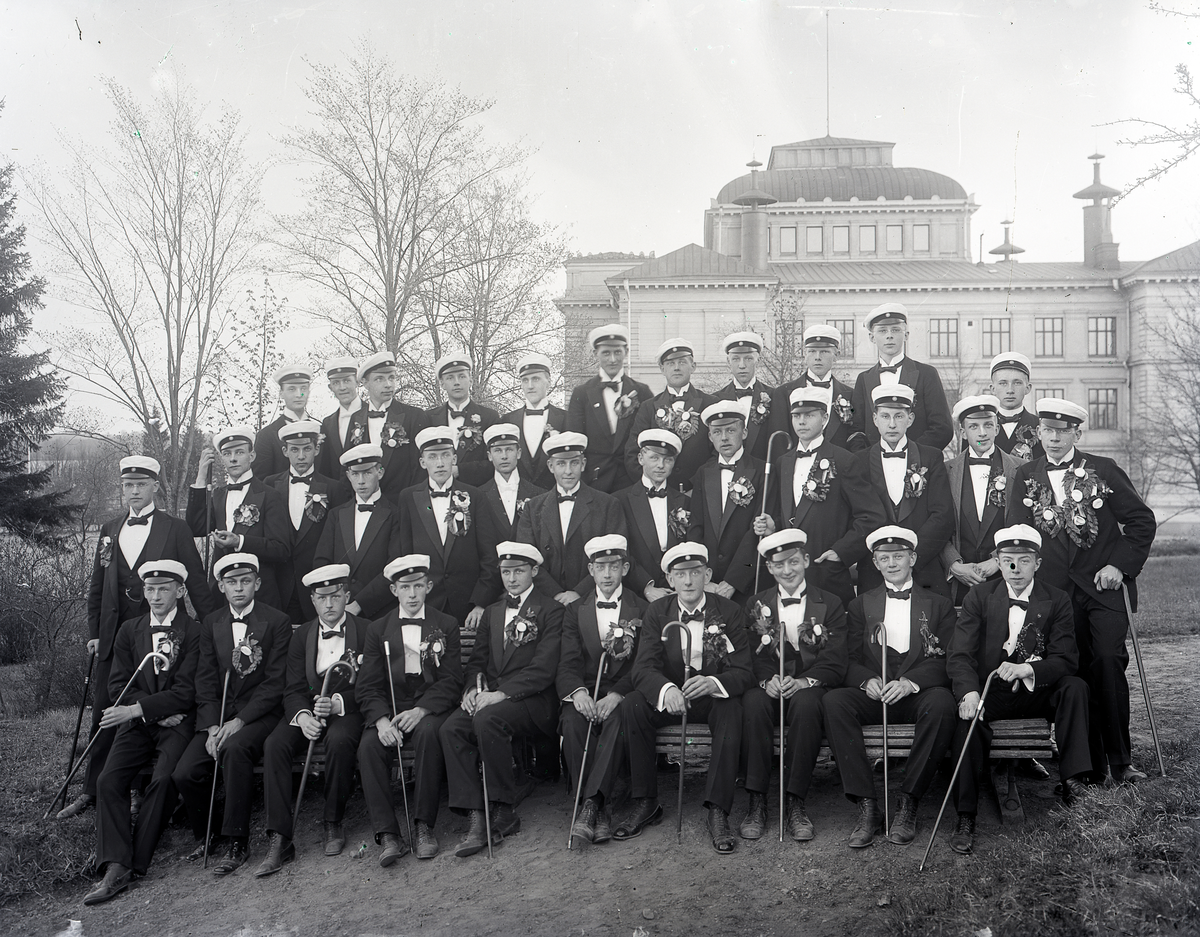 Studentgrupp i Museiparken, med Läroverket som fond. 1917.