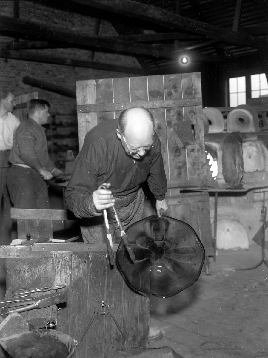 Mästare Knut Bergqvist med fat. Strömbergshyttans glasbruk, 1935.