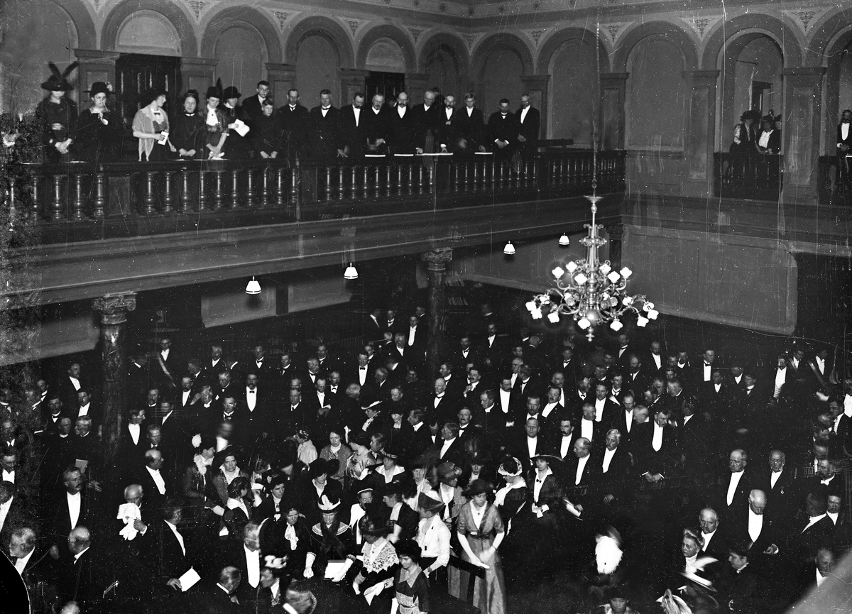 Växjö Läroverks jubileum 1914. Festligheter i läroverkets aula.