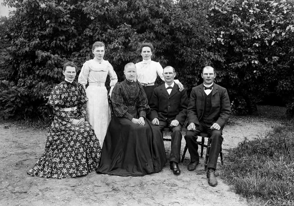 Familjeporträtt i trädgård. 1905, okänd plats i Kronobergs län.