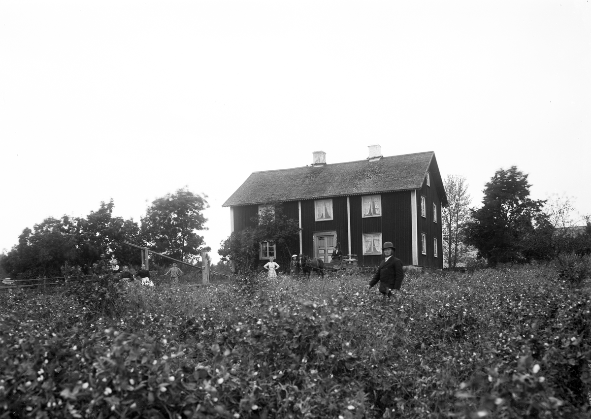 August Johnsson med familj vid sitt hus i Urshult, ca. 1900.