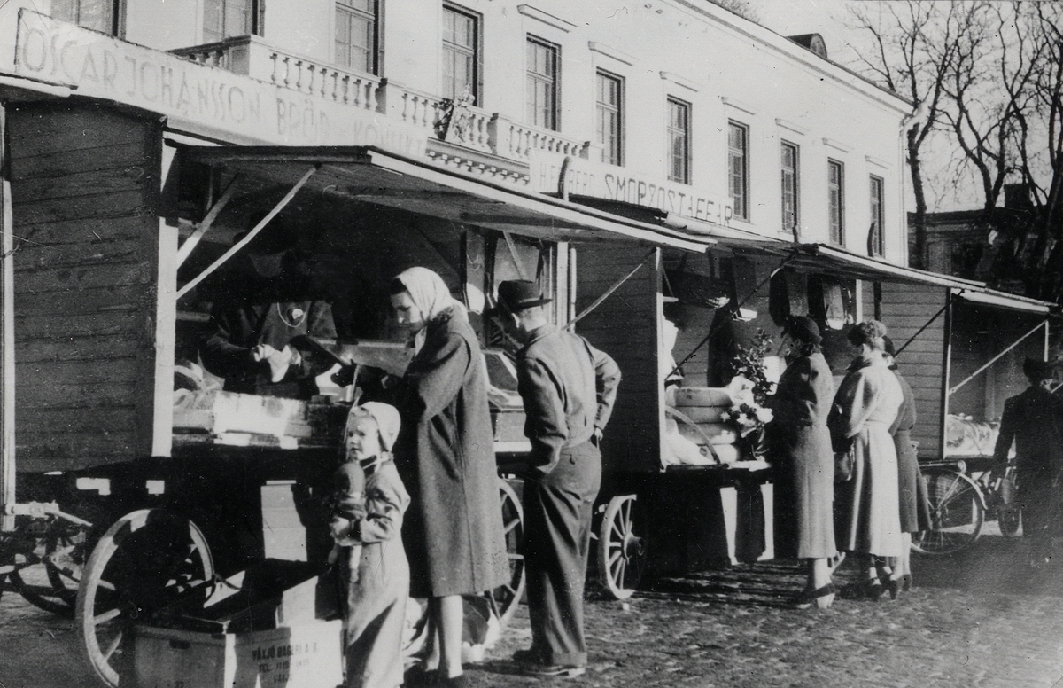 Torghandel på stortorget vid residenset, Växjö. Ca. 1950.