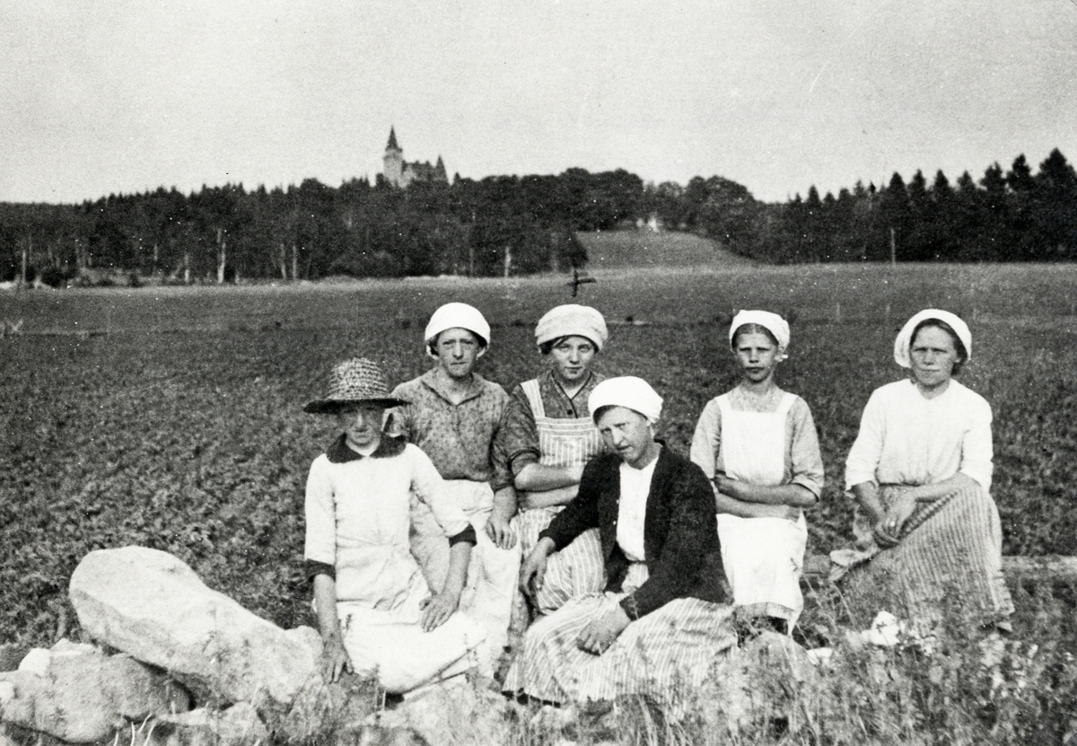 Några unga kvinnor gallrar rovor på åkrarna vid Teleborgs slott. Ca 1920.