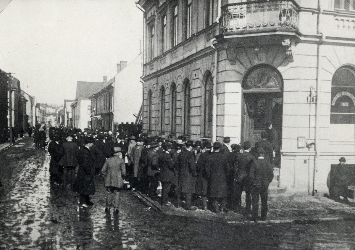 Lång kö utanför Växjö systembolag, 1917. Hörnet Klostergatan - Norra Järnvägsgatan.
