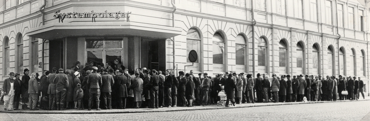 Växjö systembolag, april 1963. Kö utanför systembolaget till följd av strejk vid Spritcentralen.