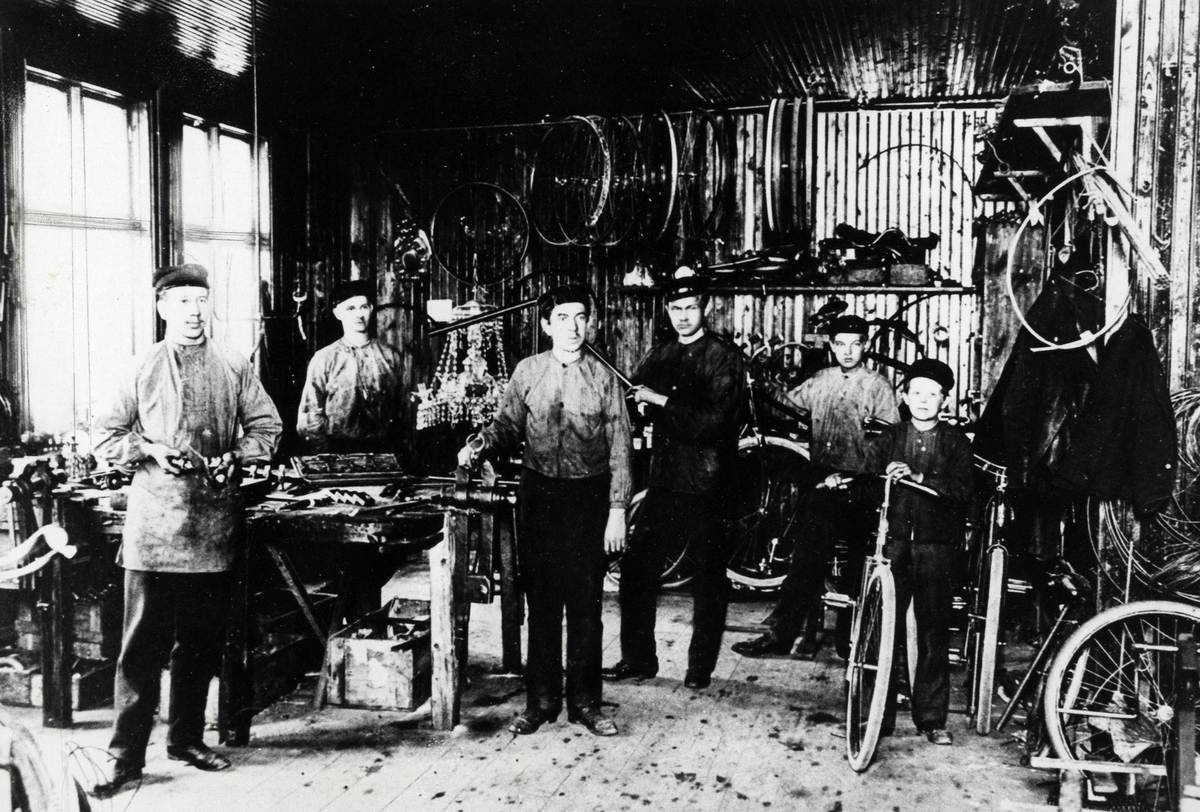 Gördelmakare Alf (Alfred) Bratts verkstad (cykelverkstad), Växjö. Personalen har ställt upp sig för ett gruppfoto. 1910-tal.