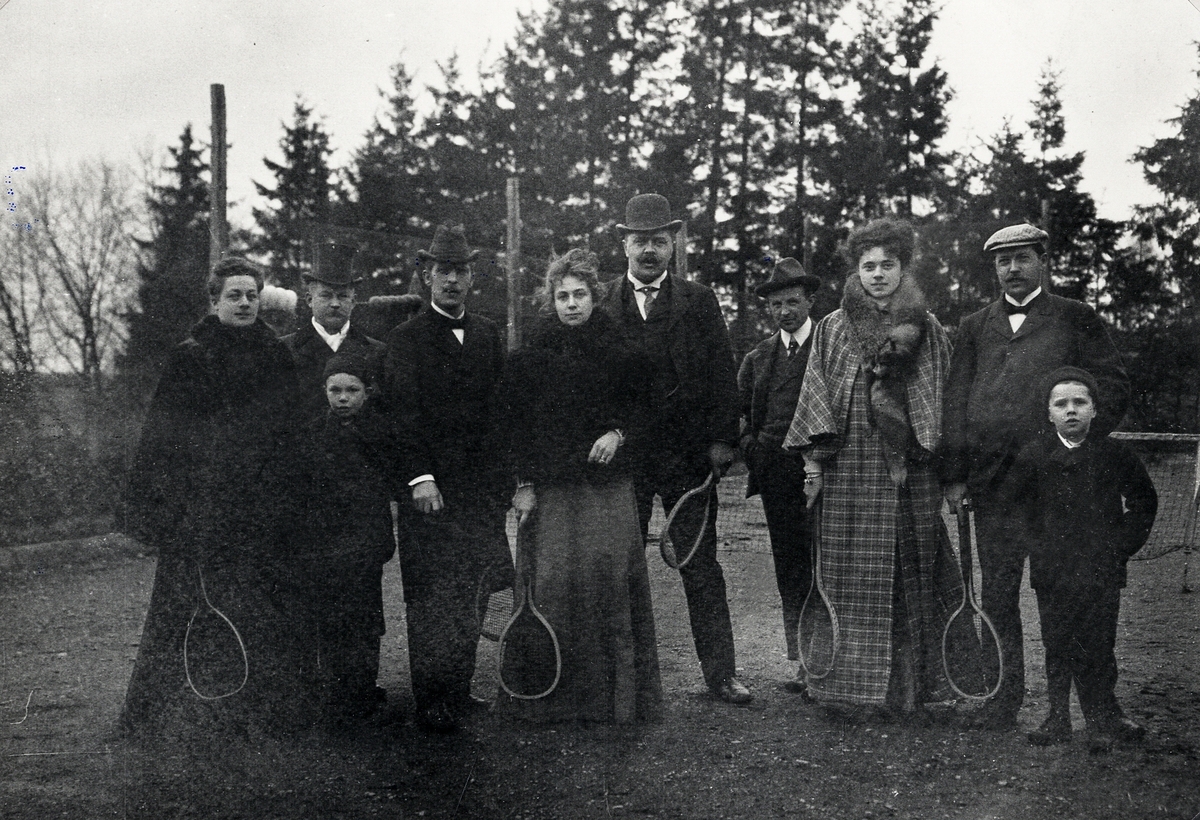 Direktör Arvid Knöppel med familj och vänner vid tennisplanen vid Kristinebergs bryggeri, 1905.