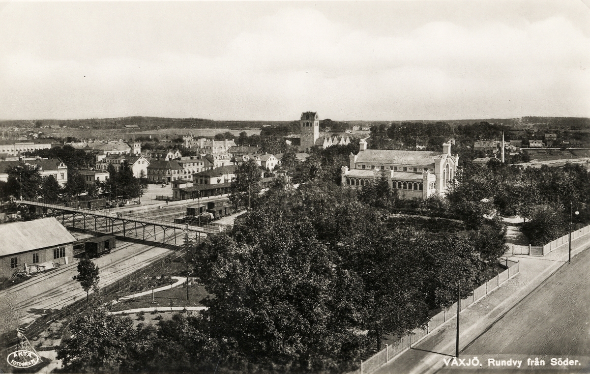 Växjö. Rundvy från söder, ca 1930. Fotot troligen taget från huset på Argus 3. Man ser järnvägsbron, en bit av Norra Järnvägsgatan med järnvägsstationen, domkyrkan och Smålands museum m.m.