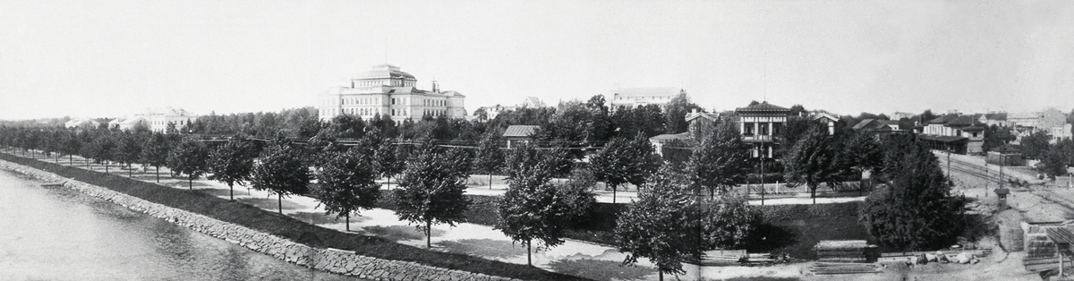 Vidvinkelvy mot sydväst med fr. v.: Växjö lasarett, Växjö läroverk, Smålands museum (taket), dåv. järnvägsrestaurangen och en del av stationsområdet, Växjö, ca 1905.