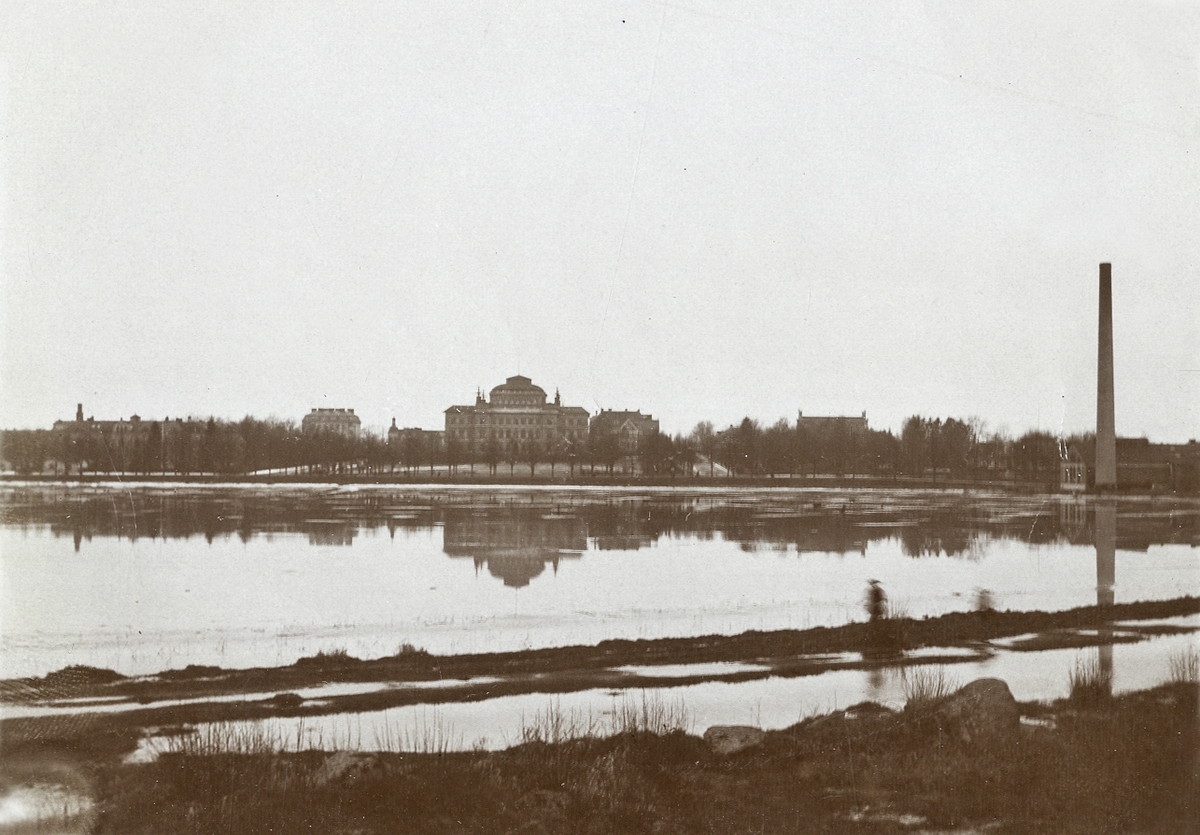 Vy över Växjösjön mot sydväst, ca 1900. Fr.v. ser man: lasarettet, Växjö flickskola, Växjö högre allmänna läroverk Smålands museum (taket) och dåv. elverket med skorsten. I förgrunden syns en man som går på järnvägen.