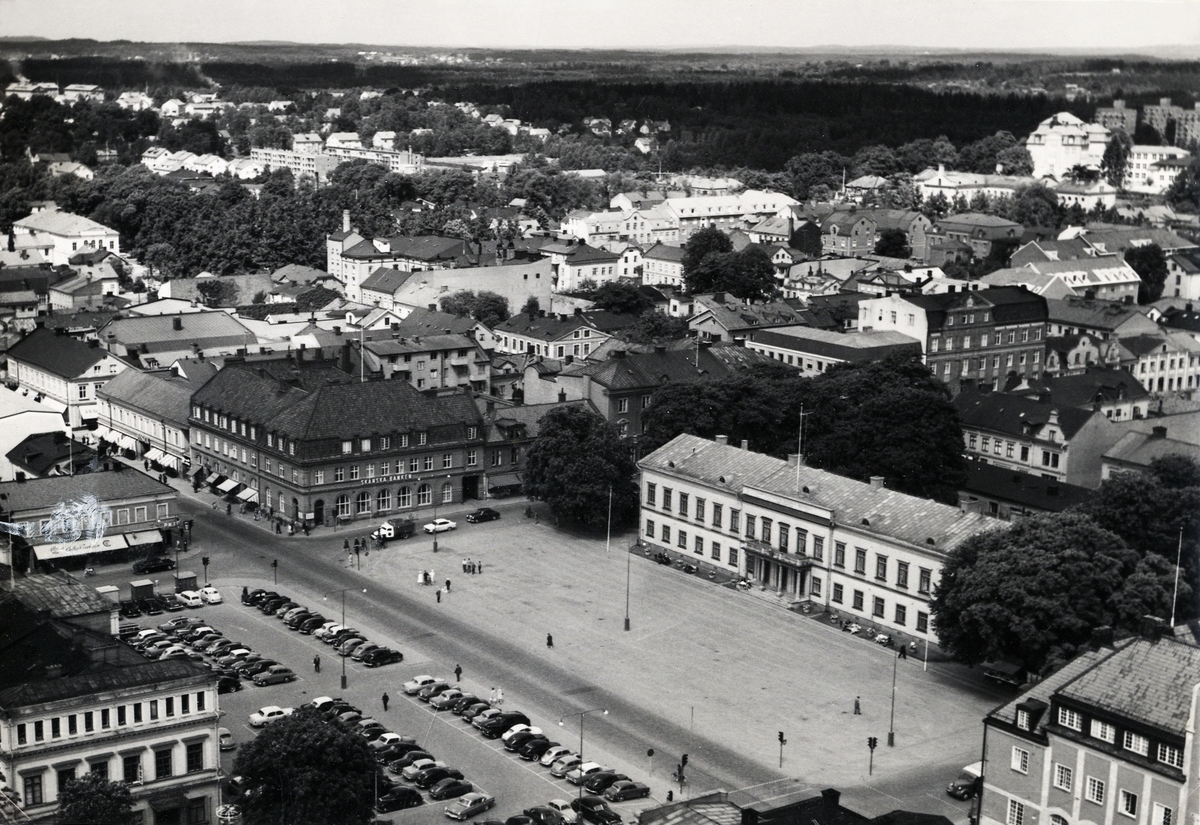 Växjö centrum, flygfoto ca 1960. Stortorget i förgrunden med residenset. I bakgrunden syns de nya husen (under byggnad) vid Liedbergsgatan och till höger därom Ringsbergsskolan.