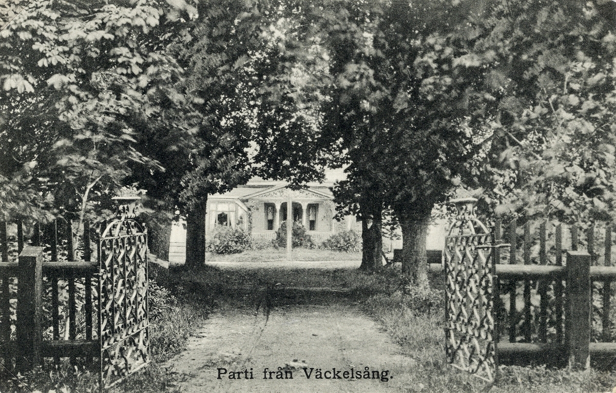 Parti från Väckelsång. Vy genom en kort allé mot ett bostadshus med veranda, 1913.