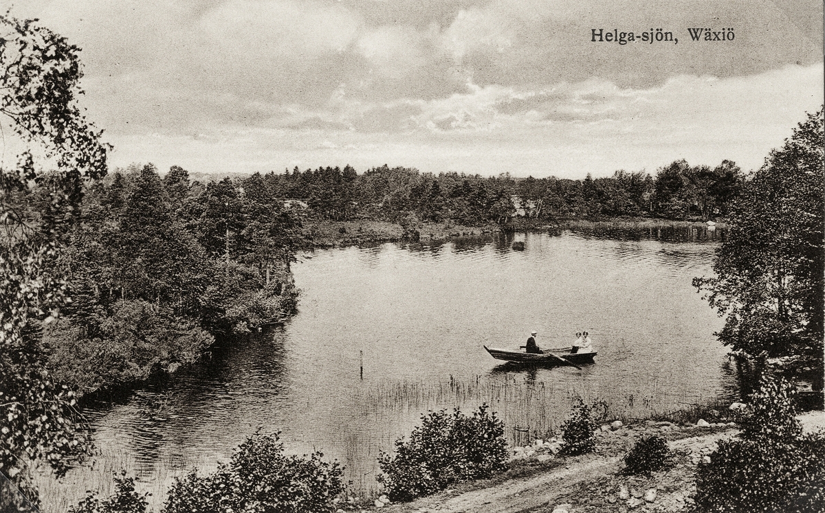 Helgasjön, Växjö, ca 1912. Några personer är ute och ror i en eka. I bakgrunden skymtar några villor bland buskagen.