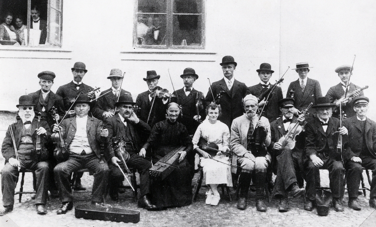 Spelmän samlade för en tävling i samband med operasångerskan Christina Nilssons 70-årsdag i Växjö 1913.