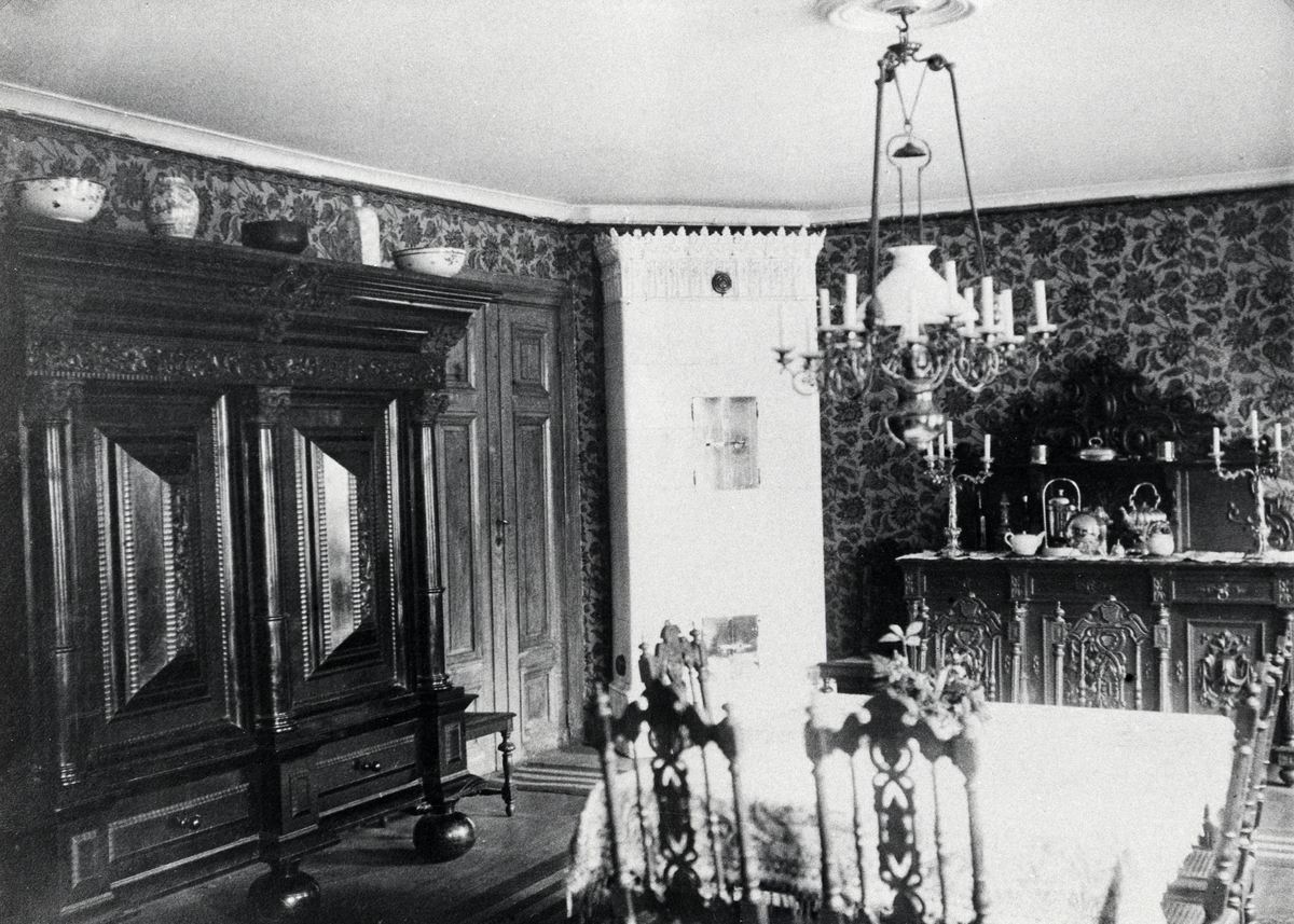 Skirsnäs herrgård (Skir Norregård), Växjö landsfs, ca 1890. Interiör, matsal.