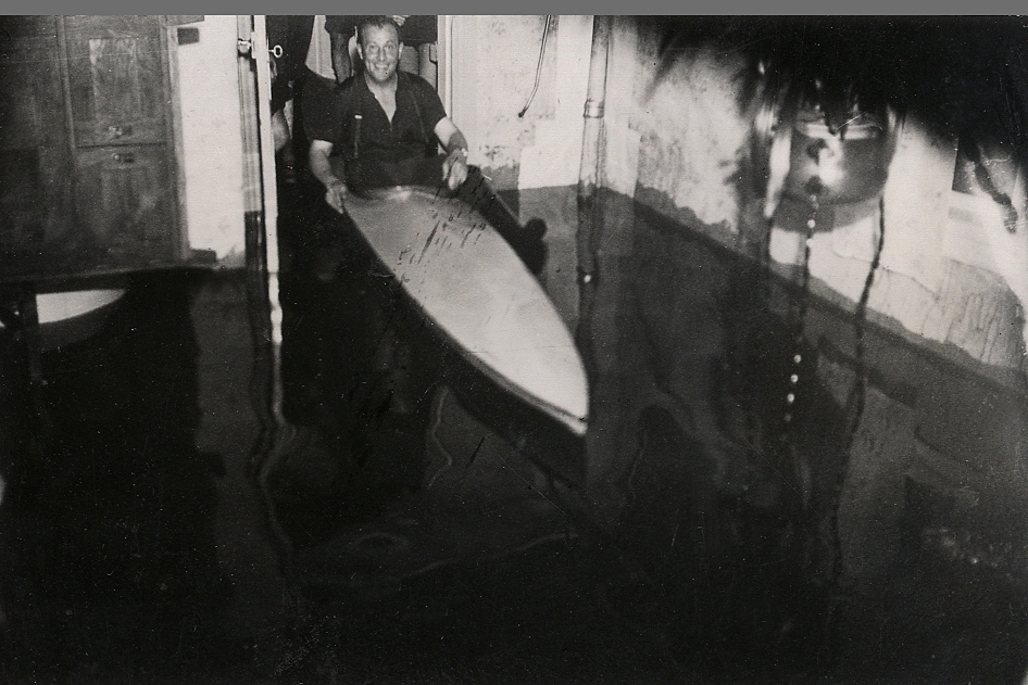 Översvämning på Liedbergsgatan, Växjö, 1940. Gustaf Granqvist i sitt översvämmade hem.