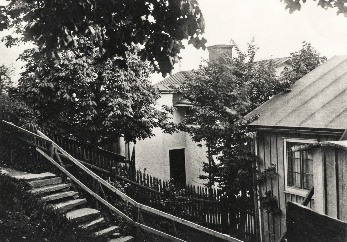 Gångväg med trappa och bostadshus vid Staglaberget, Växjö, ca 1940. Troligen bakom Ingelstadsvägen.