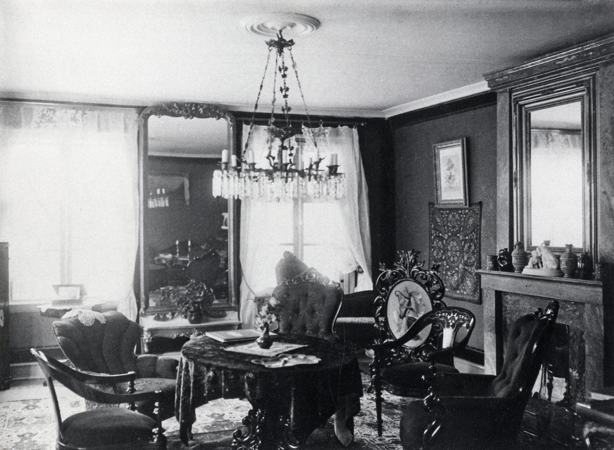 Skirsnäs herrgård (Skir Norregård), Växjö landsfs, ca 1890. Interiör, salong.