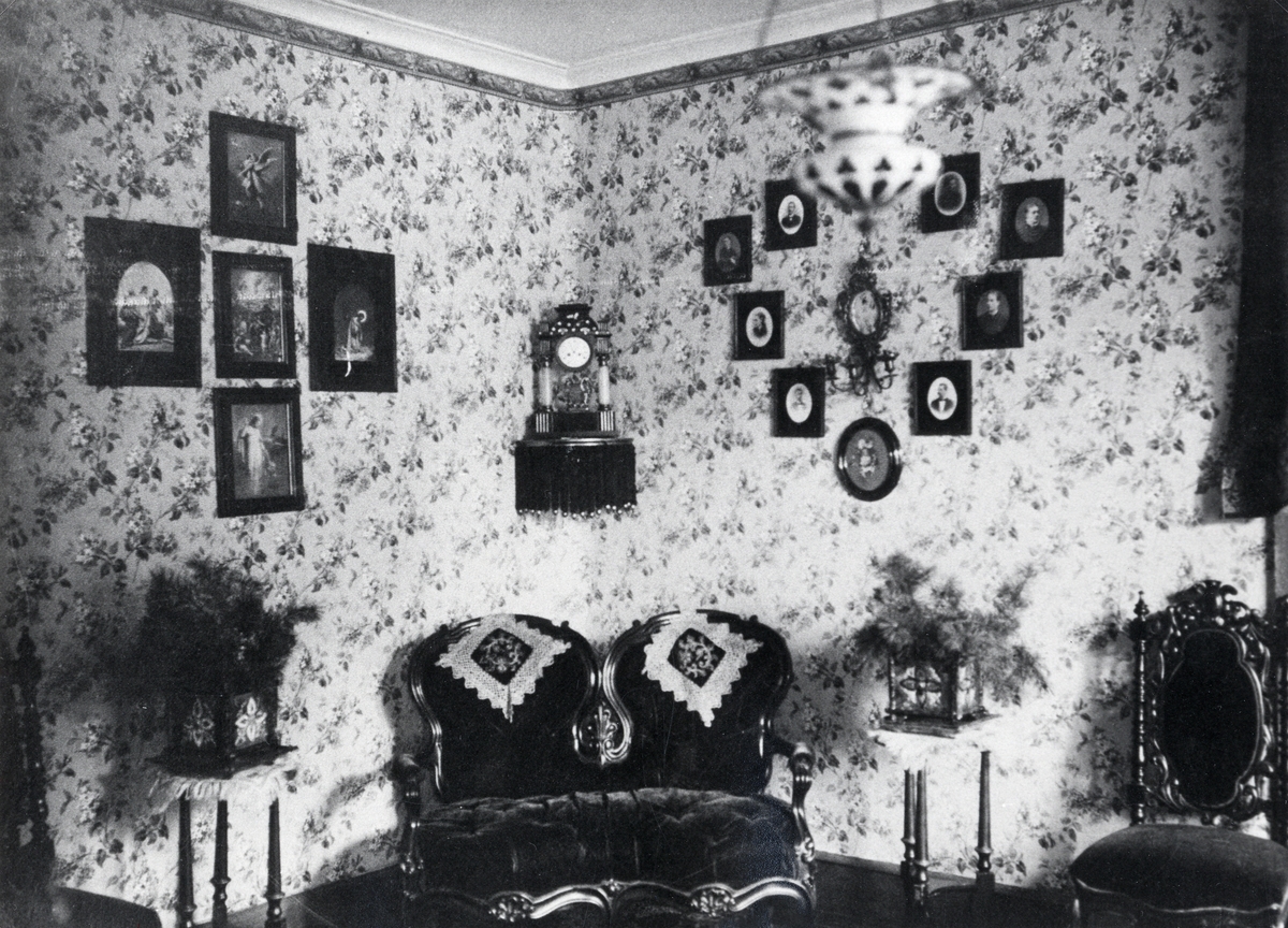 Skirsnäs herrgård (Skir Norregård), Växjö landsfs, ca 1890. Interiör, salong.