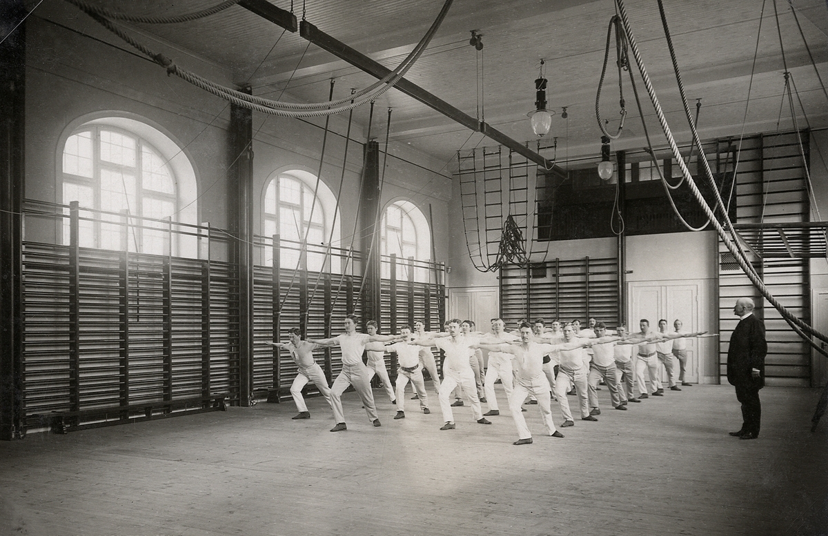 Gymnastikdirektör Nils Danckwardt leder en manlig gymnastiktrupp, 1915.