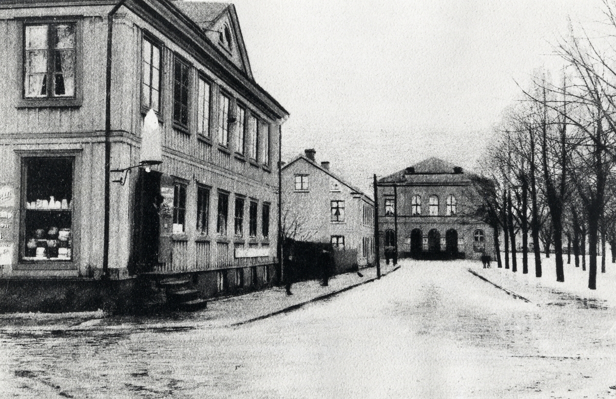 Hörnet Norrgatan - Bäckgatan. Växjö ca. 1900. Västerut mot teatern.
