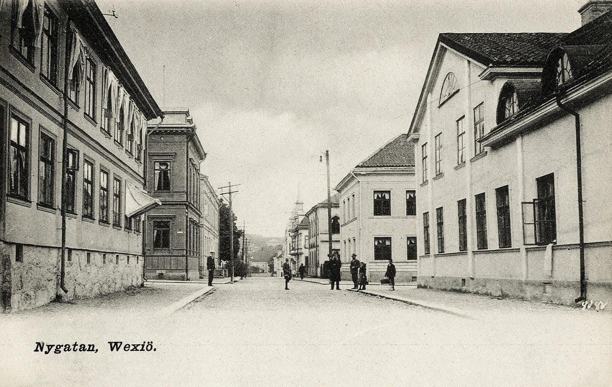Nygatan, Växjö, strax vid korsningen mot Kungsgatan. Tidigt 1900-tal.