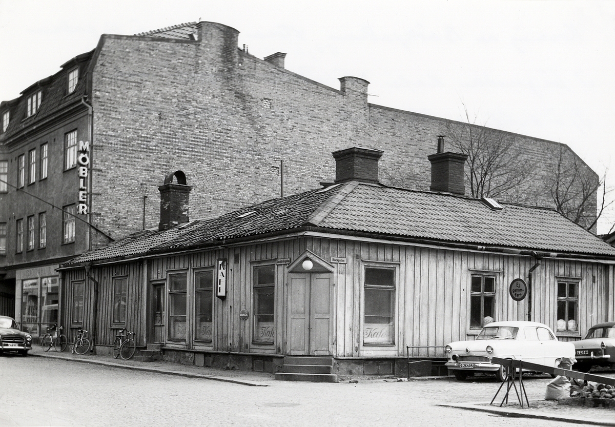 Kafé Stjärnan och Sjödahl & Haglinds inför rivning. Sandgärdsgatan, Växjö, ca. 1960.