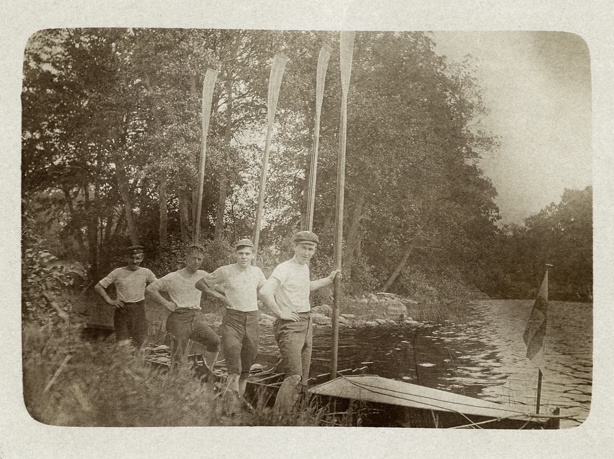 Fyra unga kanotister vid ett vattendrag (Helgasjön?), ca 1915.