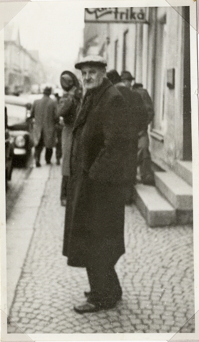 Sune Johan Svensson utanför en affär på Klostergatan. Växjö, 1950-tal.