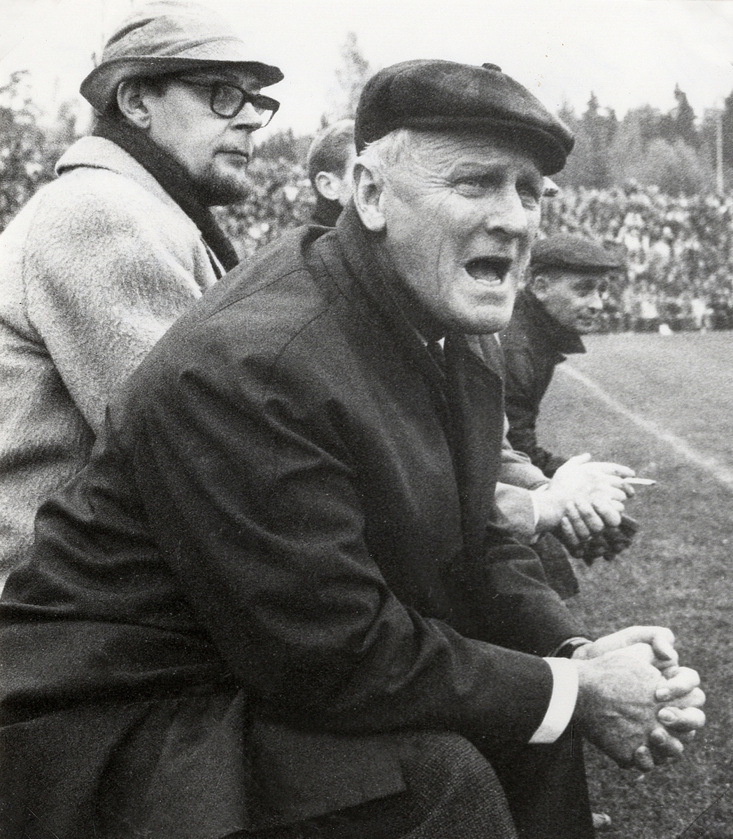 Stig Svensson, ordförande i Östers IF, m.fl. hejar på Östers IF. Växjö ca 1970.