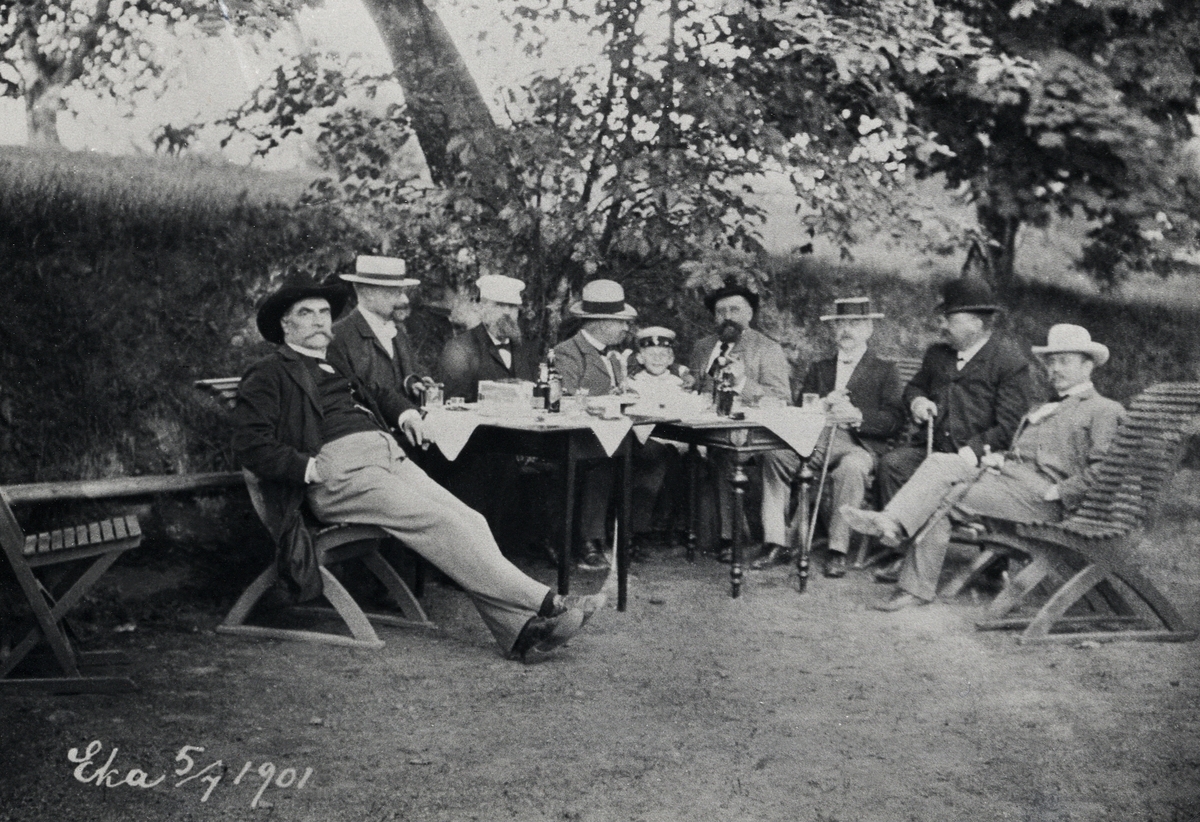 Ett antal herrar (och en pojke) sitter runt några bord med förfriskningar i en trädgård.