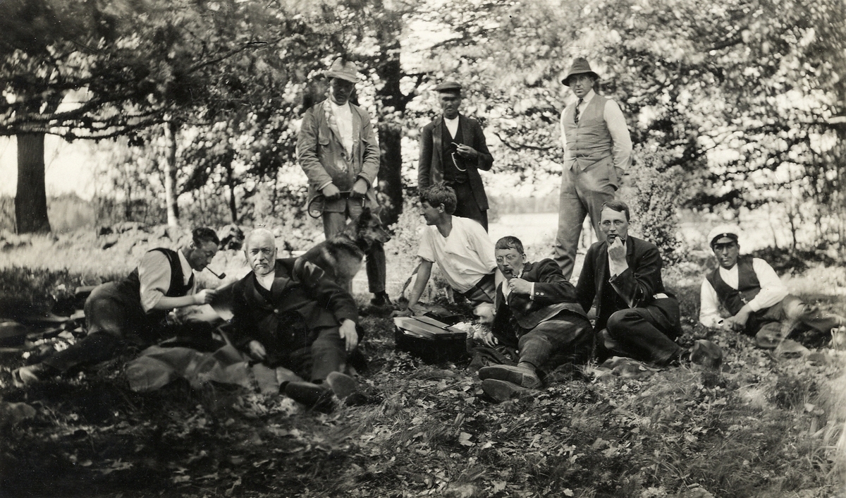 Urshult, ca 1920. Överlärare Frans Berggren med gäster i en skogsbacke.