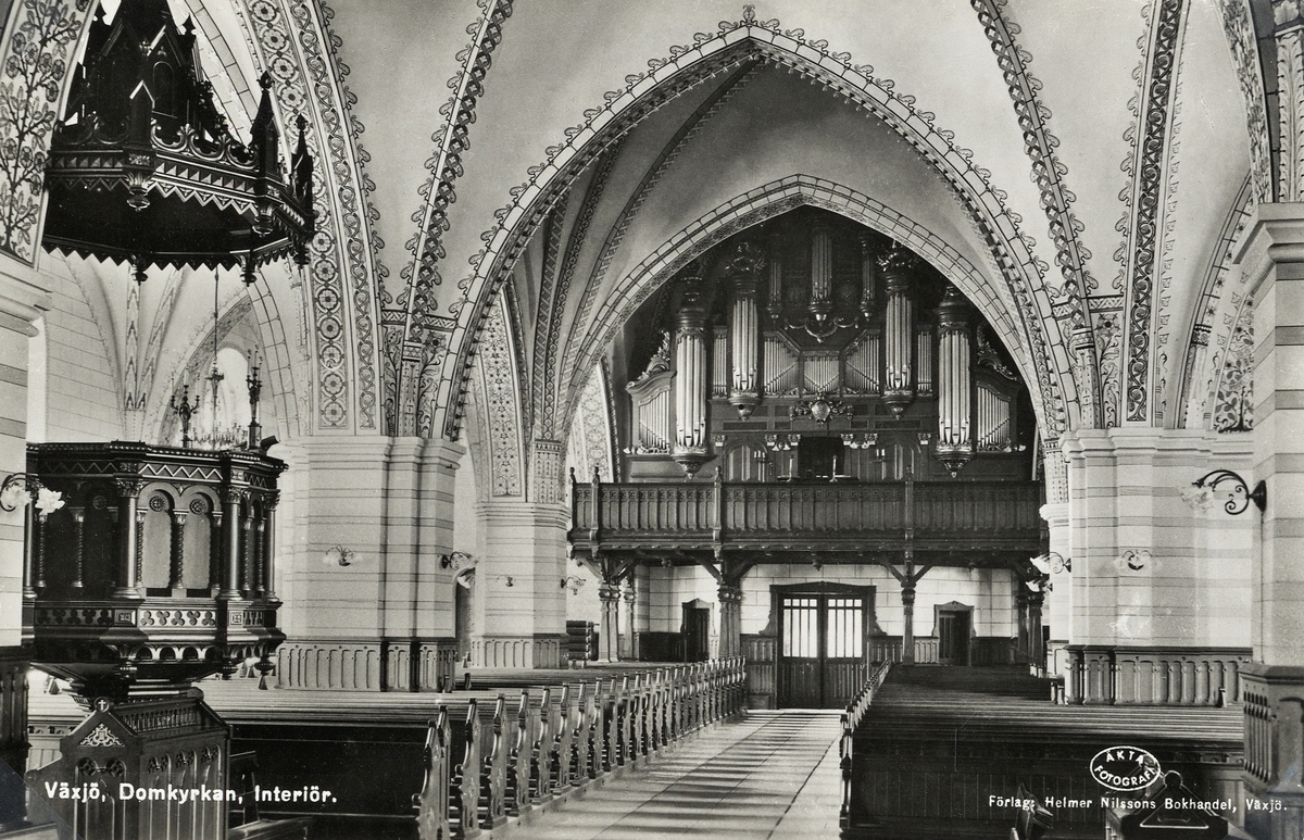 Växjö domkyrka, interiör, ca 1935. Vy mot orgelläktaren.