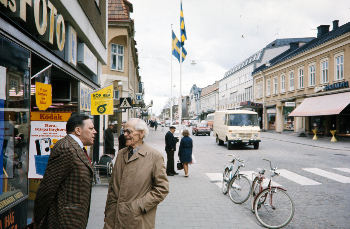 Storgatan, Växjö. Nils Hyltén-Cavallius pratar med en herre på trottoaren. I bakgrunden syns bl a Qvidings bokhandel.