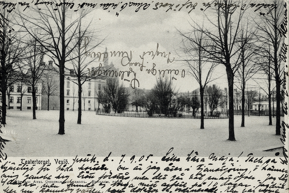 Teatertorget, Växjö, 1905. Snett till vänster ser man några byggnader i kvarteret Munken (1 och 8). Till höger om planteringen syns några av husen i kvarteret Nunnan (1 och 2).