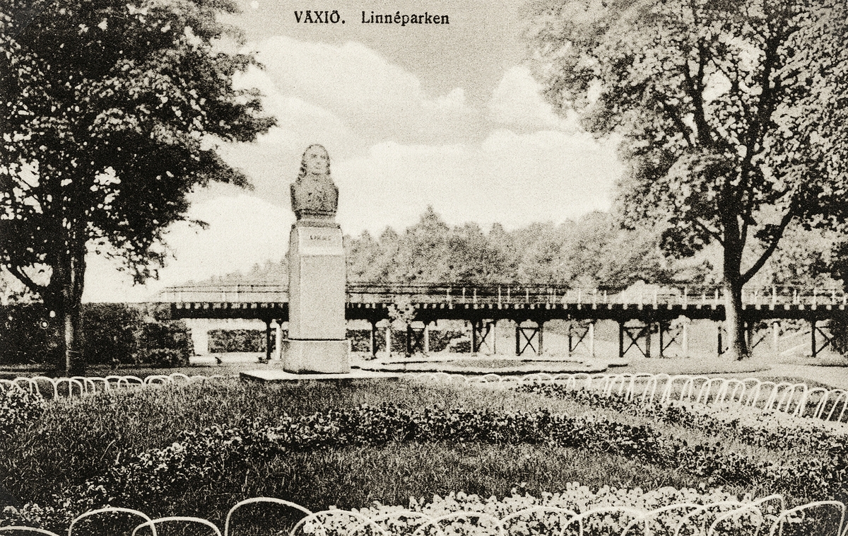 Linnéparken med Carl von Linnés byst och järnvägsbron, Växjö, 1910-tal.