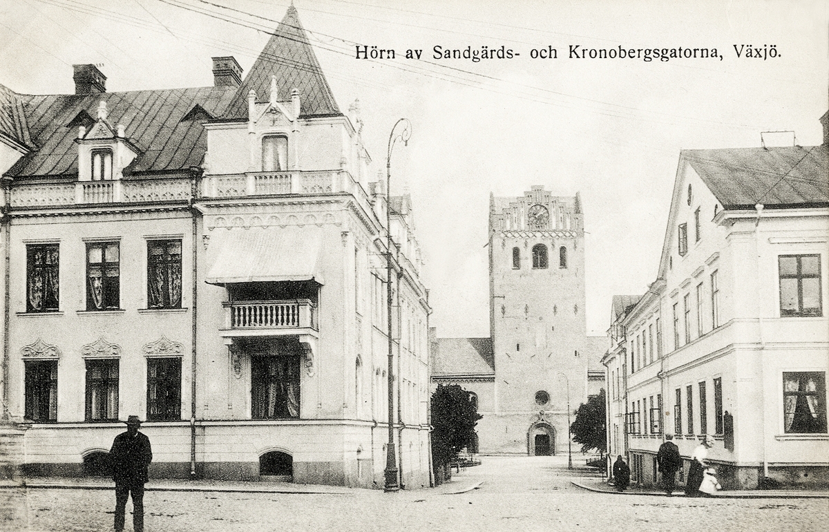 Hörnet av Kronobergsgatan - Sandgärdsgatan, ca 1910. Till vänster ser man apotekshuset, kv. Lejonet 3 och till höger några av husen i kvarteret Kristina, med domkyrkan i bakgrunden.
