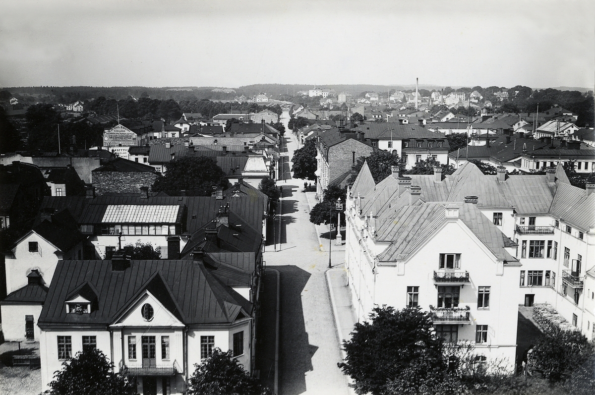 Sandgärdsgatan västerut, från domkyrkotornet, ca 1920. Närmast ser man husen i kvarteren Kristina till vänster (med fotograf Hilding Jönssons ateljéfönster uppe under taket) och Lejonet till höger. Långt borta till vänster ser man också den reklamspäckade gaveln till Spritbolagets hus på Norra Järnvägsgatan.